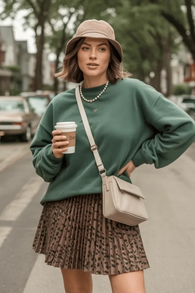 Animal prints are eternal, and this leopard print pleated skirt paired with a cozy forest green sweatshirt is a perfect example. This outfit strikes the ideal balance between cute spring skirt outfits and classy spring skirt outfits, making it incredibly versatile. The green sweatshirt adds a rich, earthy tone that complements the neutral leopard print beautifully, while the pleated skirt adds movement and a touch of sophistication. Top it off with a beige bucket hat and crossbody bag for a look that’s effortlessly chic.