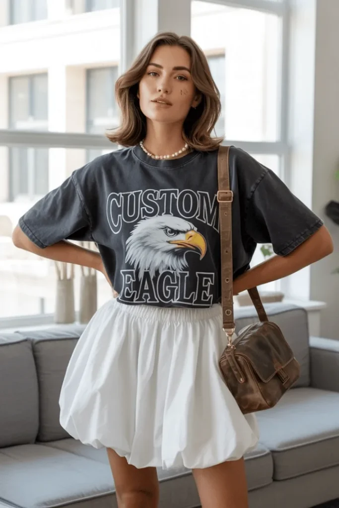 There’s something irresistibly fun about pairing a vintage-inspired graphic tee with a crisp white bubble mini skirt. This look is the epitome of cute spring skirt outfits that don’t try too hard but still make a statement. The relaxed fit of the tee balances the flirty volume of the skirt, creating a silhouette that’s both playful and flattering. Add a pearl necklace for a touch of elegance, and you’ve got a spring skirt outfit casual enough for coffee runs yet chic enough for an afternoon gallery visit.