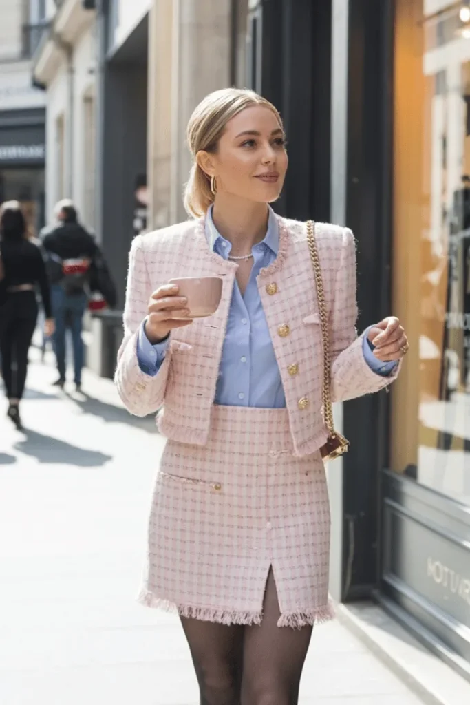 If you’re searching for business casual spring skirt outfits that feel polished yet fashion-forward, a pink tweed skirt outfit spring is your answer. This ensemble channels Parisian elegance with its matching jacket and skirt set in soft blush tones. The tweed texture adds dimension and sophistication, while the structured silhouette creates a streamlined look that’s perfect for spring skirt outfits work. Layer a light blue button-down underneath for a preppy spring skirt outfit vibe that feels both professional and personable.