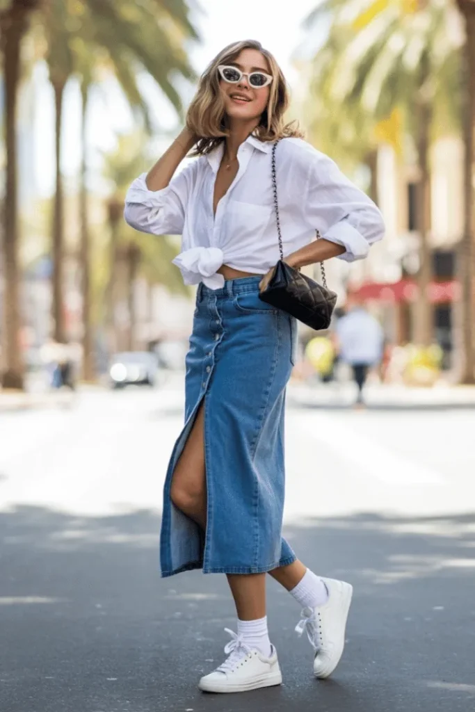 A denim midi skirt spring outfit is the ultimate crowd-pleaser for women who want style and practicality in equal measure. This look features a button-front denim skirt with a thigh-high slit, styled with an oversized white shirt and white sneakers. It’s the definition of spring skirt outfits casual that still feels intentional and fashion-forward. The denim fabric makes it durable enough for everyday wear, while the midi length and front slit add a feminine, flirty touch.