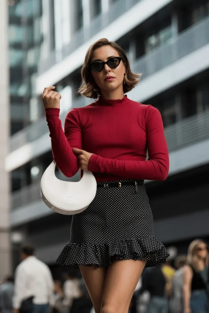 The color contrast between the rich red and classic black-and-white polka dots is striking and sophisticated. Add a white hobo bag for a soft, neutral accent that doesn’t compete with the bold print. Black sunglasses tie the look together while adding a hint of mystery and edge. This outfit proves that mixing patterns and textures can be incredibly chic when done with intention and balance.