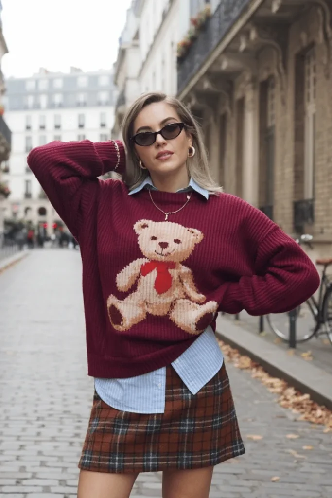 For those who love classy spring skirt outfits with personality, this look is a must-try. The burgundy and brown color palette feels rich and sophisticated, while the playful teddy bear graphic keeps it from feeling too serious. This outfit is also great for spring skirt outfits church or spring skirt outfits modest, as the layers provide ample coverage while still looking fashionable. Swap the mini skirt for a midi plaid version for an even more conservative take.