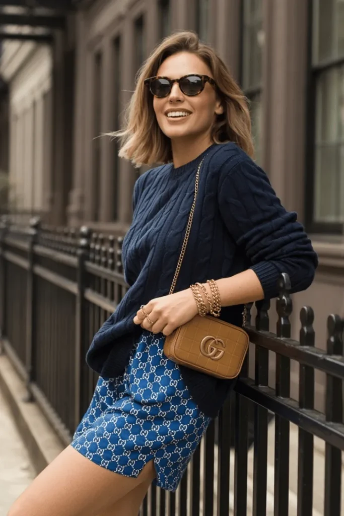 The printed shorts featuring a recognizable pattern bring unexpected luxury to this casual ensemble, proving that animal print modest spring outfits and branded pieces can integrate beautifully into modest wardrobes. While shorts might seem outside traditional modest territory, pairing them with substantial coverage on top creates overall balance that many women find comfortable. The navy tones in the print connect seamlessly with the sweater above.