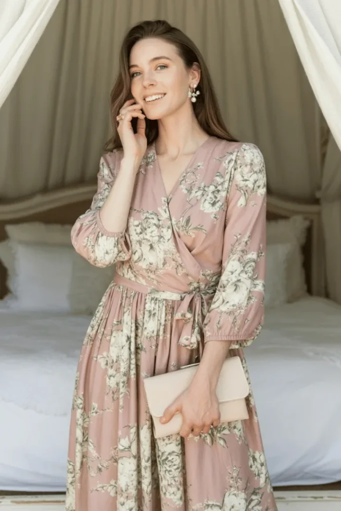 Modest spring outfits with floral dresses capture the romantic essence of the season like nothing else, and this dusty rose beauty demonstrates why florals remain eternally popular. The wrap silhouette creates definition at the waist while the flowing skirt provides generous coverage that moves gracefully with every step. Balloon sleeves add drama and femininity without revealing more skin than desired.