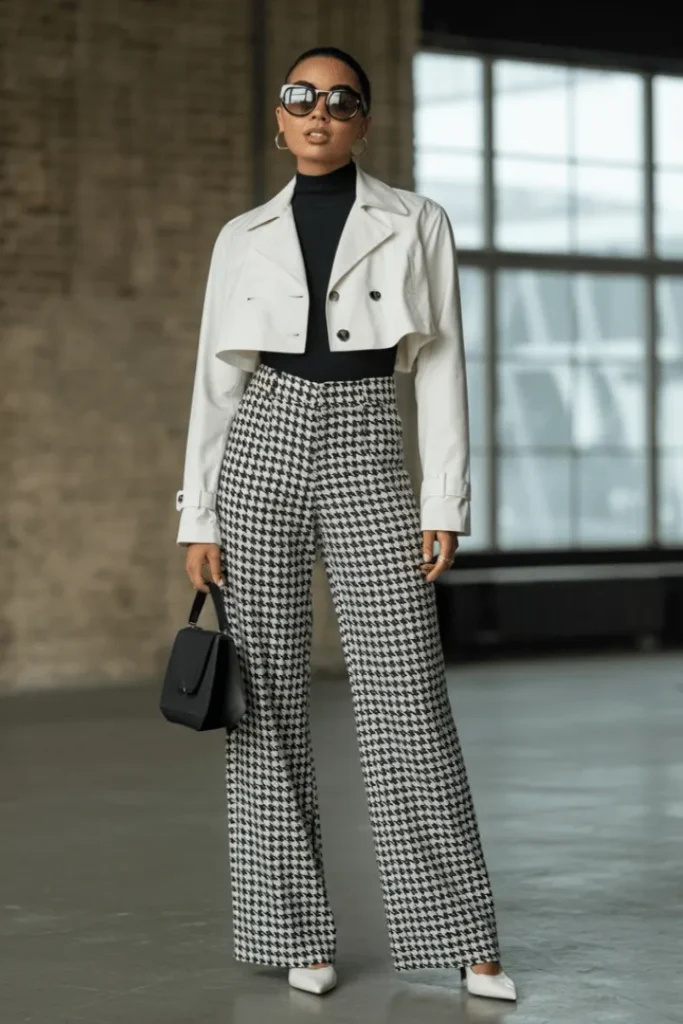 Graphic prints make bold statements in this striking black and white ensemble that feels utterly timeless. The cropped white trench jacket adds architectural interest while the fitted black turtleneck beneath provides complete coverage on top. This animal print modest spring outfit reinterprets the classic houndstooth pattern in dramatic wide-leg trousers that demand attention.