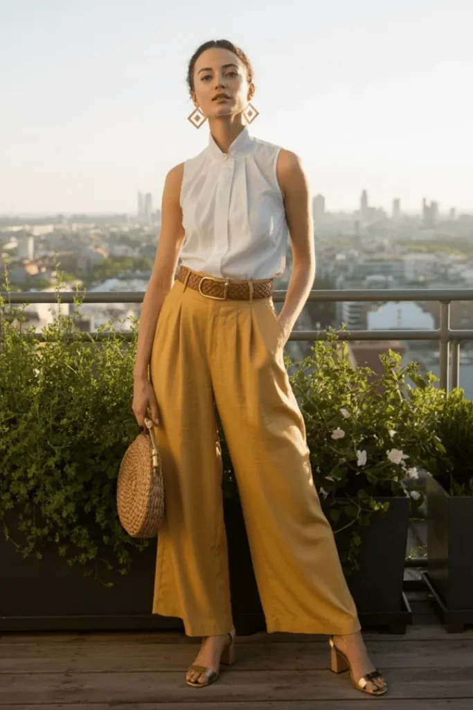 Sleeveless White Blouse with Mustard Yellow Wide Leg Pants