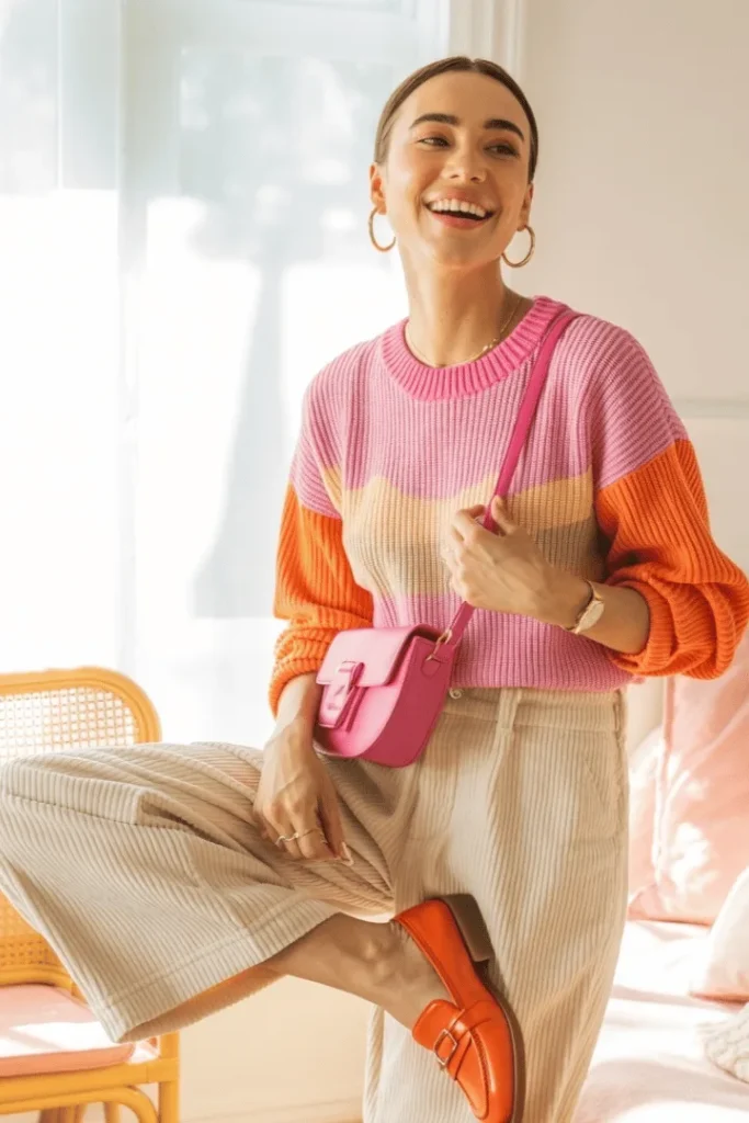 Color Block Pink and Orange Sweater with Cream Corduroy Pants