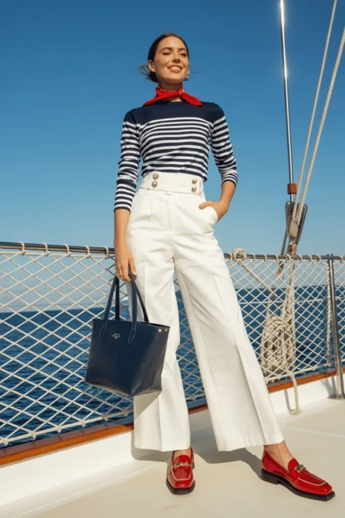 Nautical inspiration never fails to feel fresh and sophisticated, and this navy striped top with crisp white pants captures that timeless appeal perfectly. The fitted striped top provides coverage while the horizontal pattern adds visual interest and classic charm. Gold button details at the waist bridge the transition to wide-leg white sailor pants below.