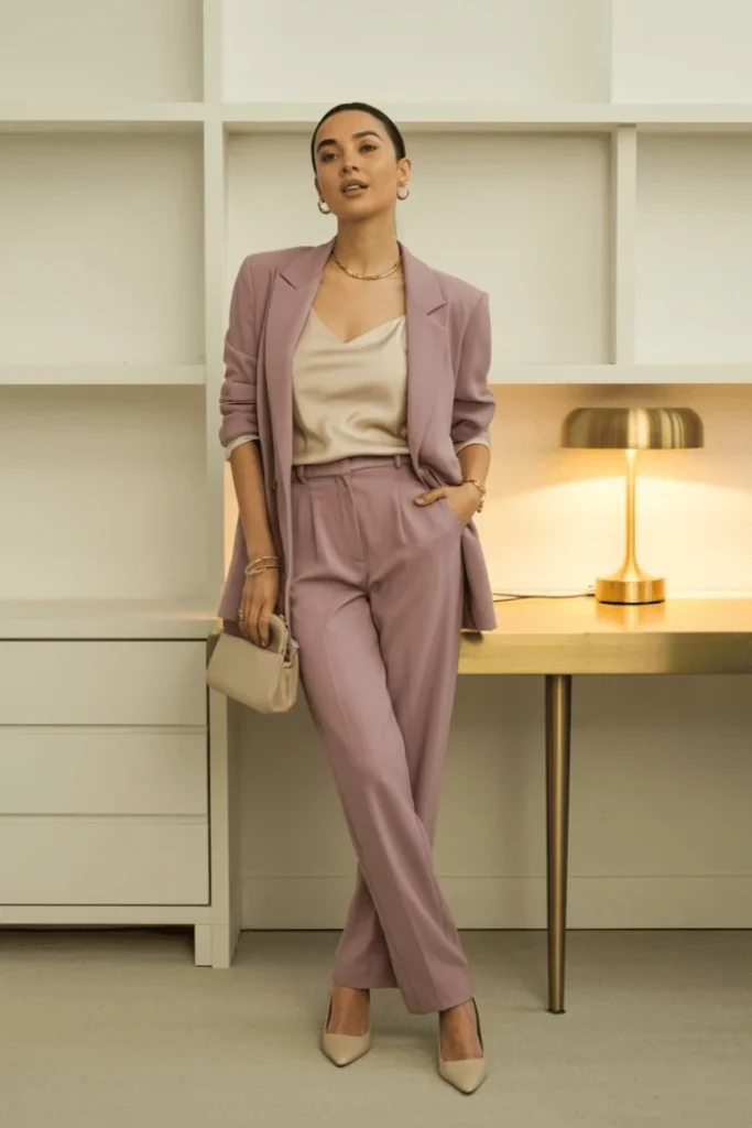 Monochrome modest spring outfits achieve their most polished expression in this stunning mauve suit that exudes confidence and sophistication. The relaxed blazer and matching trousers create an elongated silhouette that flatters beautifully while the champagne silk camisole underneath adds subtle contrast and luxurious texture. This elegant modest spring outfit proves that suiting need not feel corporate or stuffy.