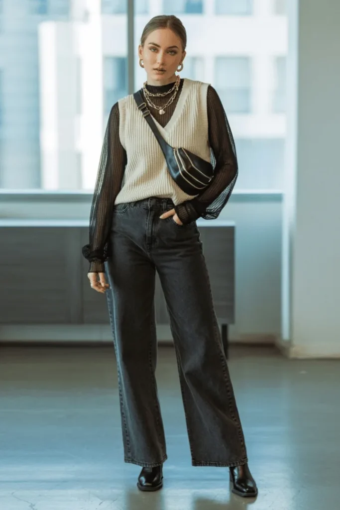 Cream Ribbed Vest Over Sheer Black Turtleneck with Dark Jeans