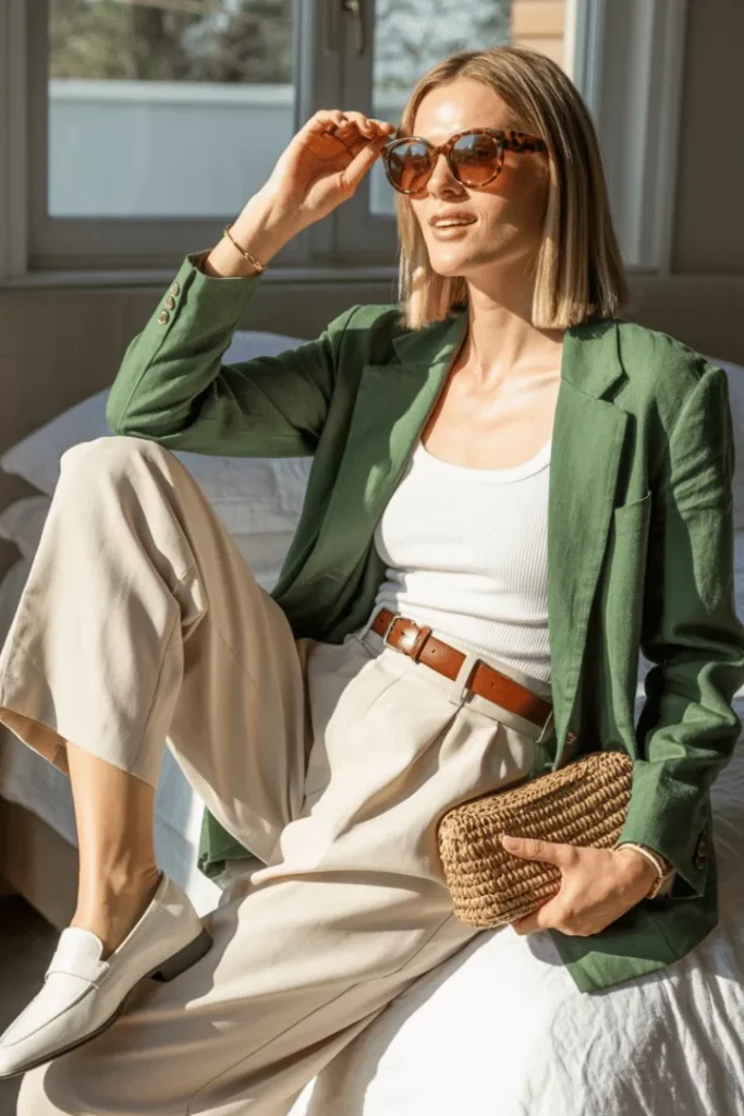 Forest Green Blazer with White Tank and Cream Tailored Pants