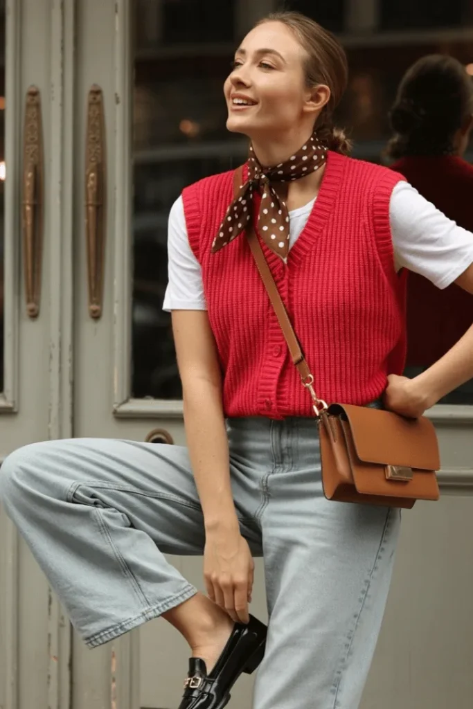 Layering remains one of the most beloved techniques in modest fashion, and this vibrant red knit vest demonstrates exactly why. The bold color modest spring outfit speaks to women who want to make a statement while maintaining their preferred level of coverage. Paired with a classic white tee underneath, the vest adds visual interest and warmth without bulk, making it perfect for those unpredictable spring temperatures that can shift throughout the day.