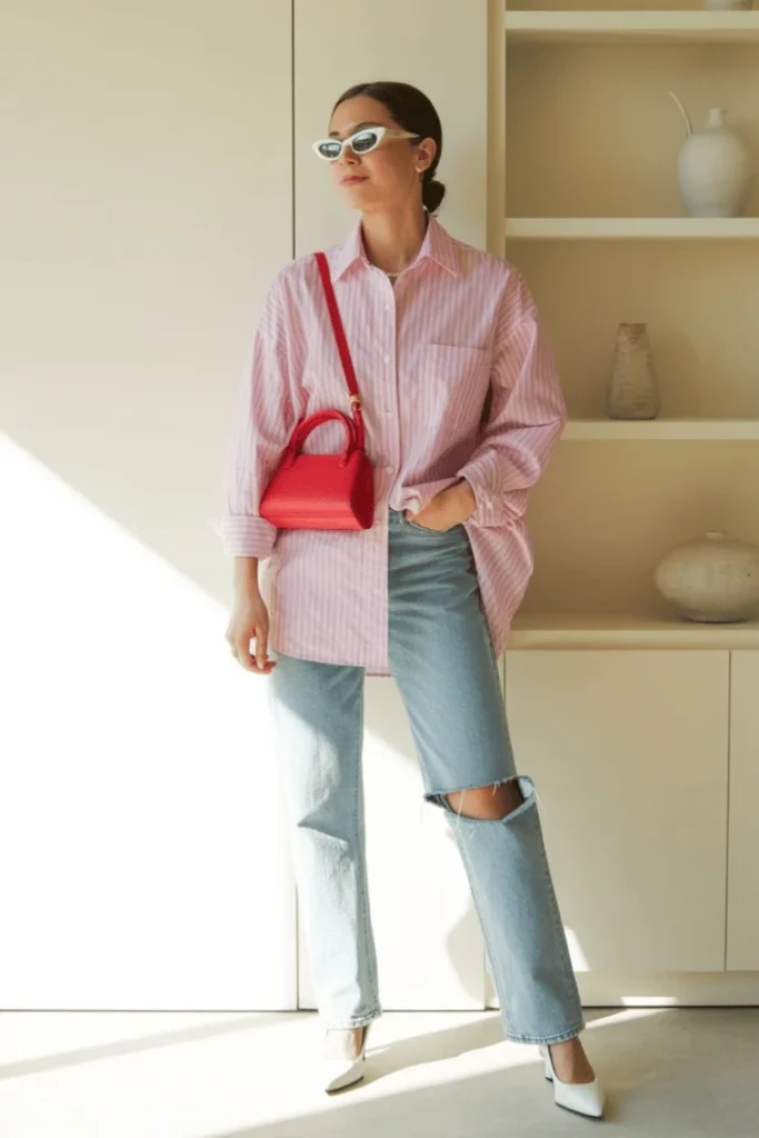 Pink Striped Oversized Shirt with Distressed Light Jeans