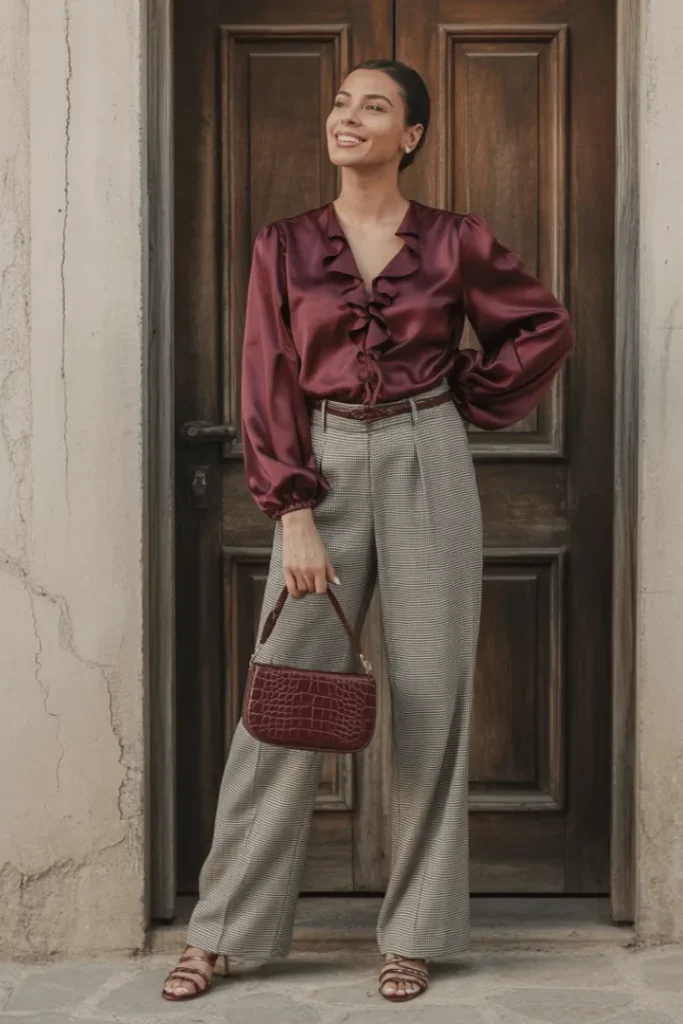 Burgundy Satin Ruffle Blouse with Houndstooth Trousers