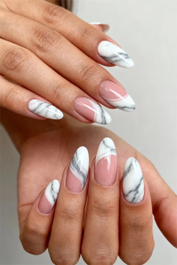 Marble nails are the perfect mix of natural inspiration and luxe vibes. This design combines soft white and gray marble effects with warm mauve-pink solid nails, creating this really sophisticated look that’s both artistic and totally wearable. The almond shape adds to that elegant, feminine feel.