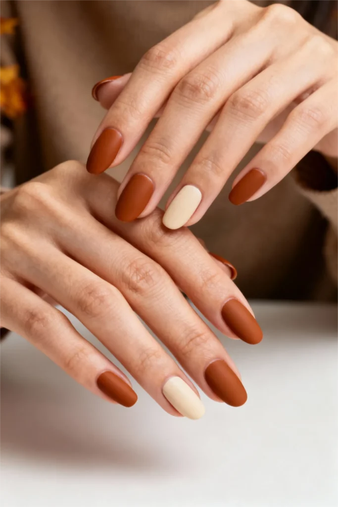 Okay, can we talk about how gorgeous this terracotta and cream combo is? It’s giving major fall vibes but in a way that feels fresh and unexpected. The burnt orange-brown terracotta is warm and earthy, while that cream accent nail keeps things from feeling too heavy or one-note.