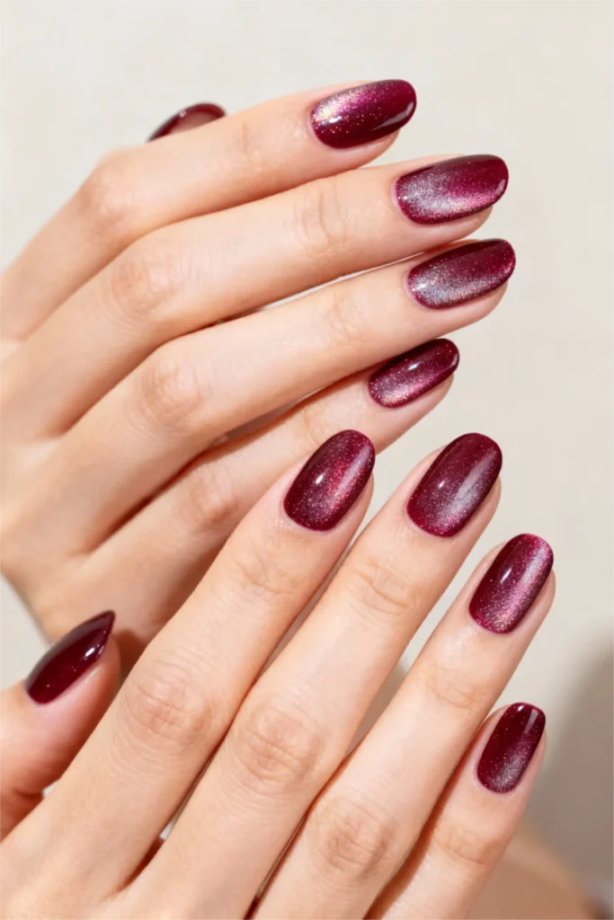 This nail inspo 2026 is all about that perfect burgundy shade – the intersection of red, purple, and brown that just reads as expensive and luxurious. The shimmer is crucial because it adds dimension to what might otherwise be a very flat, dark color. It ensures the true burgundy tone is visible in all lighting conditions.