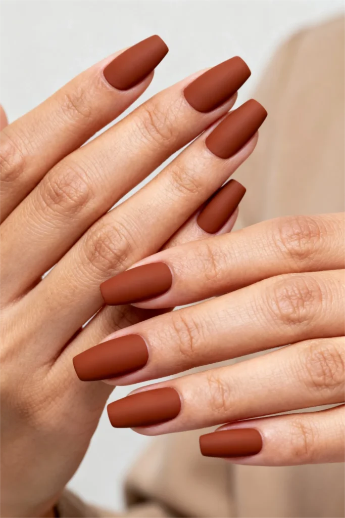 Chocolate brown is seriously having a moment, and this matte version is pure sophistication. It’s deep, warm, and rich like actual gourmet chocolate, but that matte finish takes it from potentially juvenile to absolutely grown-up and fashion-forward. The coffin shape is modern and elongating without being too dramatic.