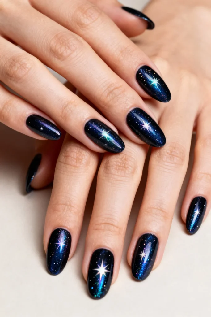 This is such a perfect winter nail inspo aesthetic – those clear, cold winter nights when the stars are brightest. But honestly, the cosmic theme works any time of year if you love space and celestial vibes. The dark base is surprisingly versatile with outfits, and it works with both casual jeans-and-sweater looks and elegant evening wear. These are definitely statement-making trendy cute nail designs 2026 that show off your personality.