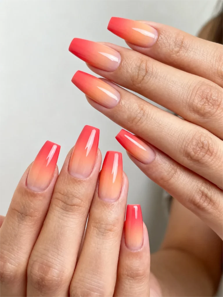 This coral sunset ombre is like wearing a beautiful summer evening on your nails. The gradient flows so smoothly from soft peachy-pink at the base to vibrant coral-red at the tips, creating this dreamy transition that’s just mesmerizing to look at. The coffin shape gives you enough length to really appreciate the full color journey without being impractical.