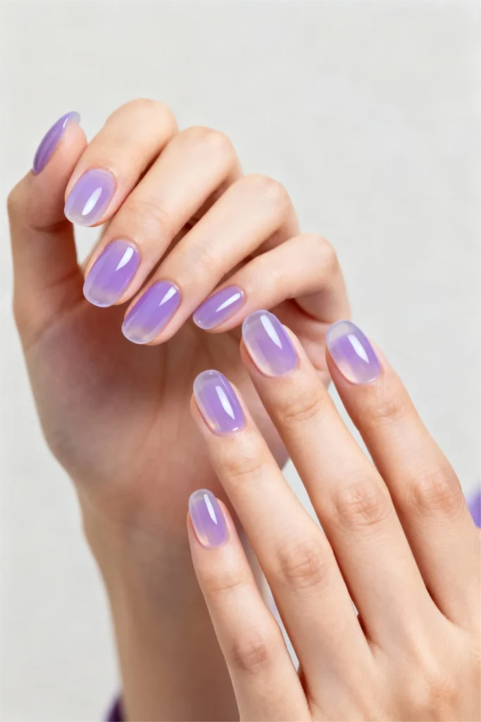 The jelly effect is what makes this nail inspo 2026 so special. It’s not solid, opaque color – it’s this soft, diffused effect where your natural nail shows through slightly, creating depth that regular polish just can’t achieve. The lilac shade is super flattering because it has both warm pink and cool blue tones.