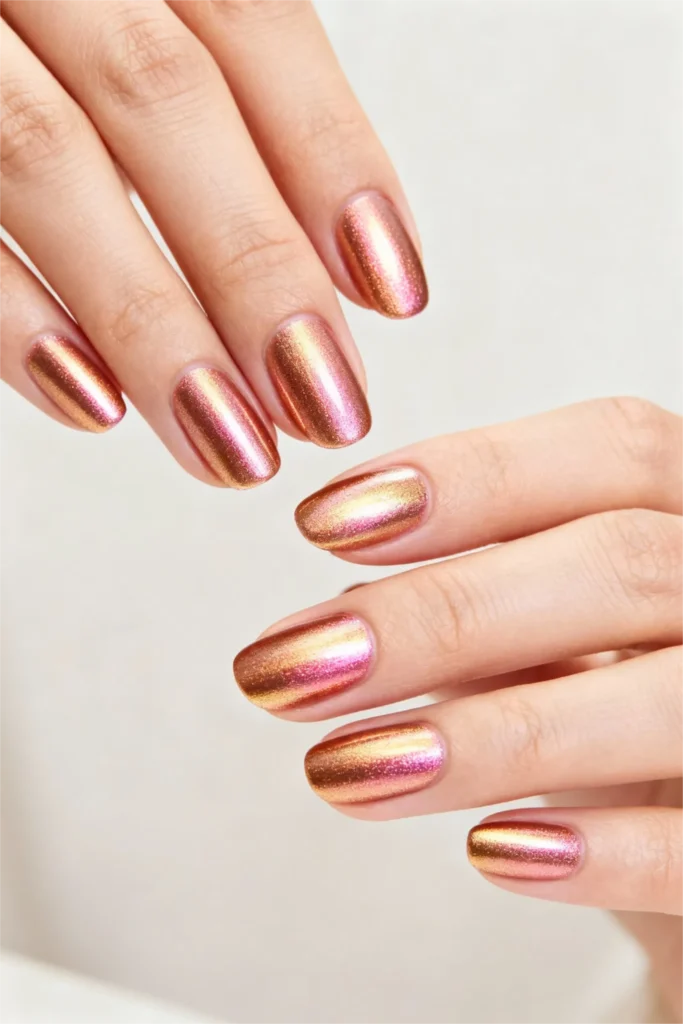 The warm undertones actually make this work beautifully for autumn nail inspo aesthetic and winter nail inspo aesthetic, especially during holiday season when metallics are everywhere. The chrome application does require some expertise, but the mirror-like finish is totally worth it. If you want bold nail color stories without bright colors, metallics deliver all the drama through finish alone.