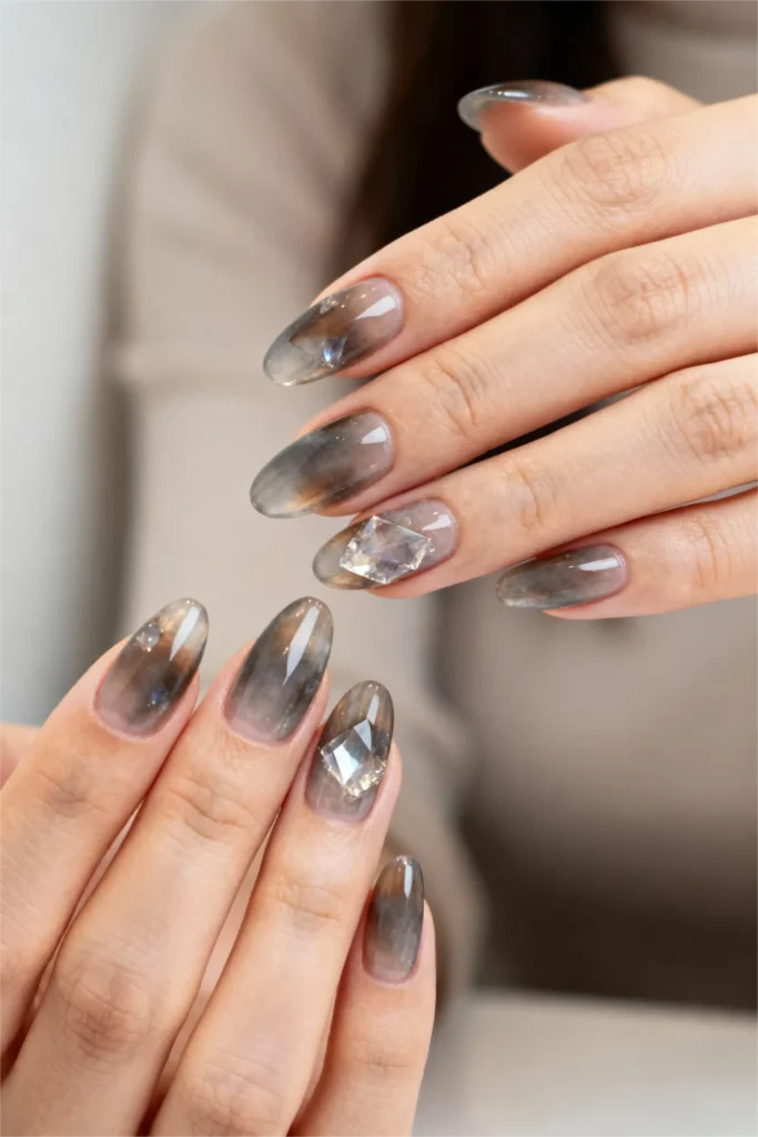 The smoky quality creates depth that flat gray polish can’t touch, and the crystals catch light alongside the chrome for cohesive sparkle vibes. As winter nail inspo aesthetic, this captures holiday glamour perfectly, though the neutral gray keeps it appropriate year-round. Chrome application is technical and best done professionally, but the result is absolutely worth it for these conversation-starting, bold nail color stories.