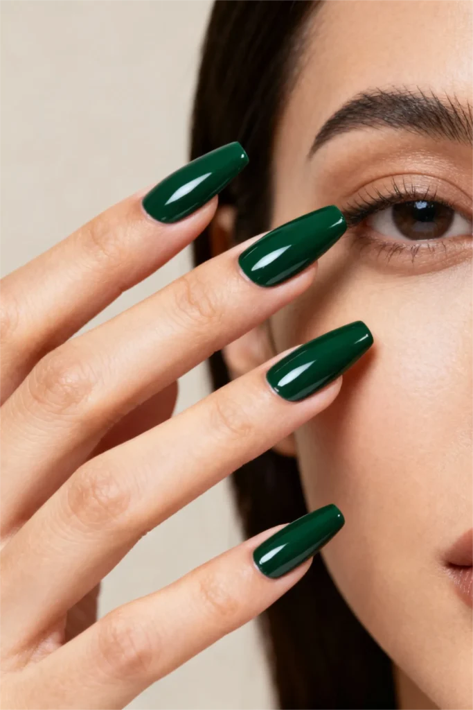 Emerald green is luxury in a bottle. This deep, jewel-toned green looks like actual precious gemstones, especially with that brilliant glossy finish that reflects light beautifully. The coffin shape gives you the perfect canvas to really appreciate this stunning color in all its glory.