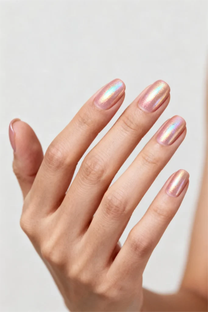 Opal nails are pure magic. This soft pink base with iridescent shimmer creates these gorgeous flashes of blue, purple, and green that shift and change depending on the light – just like real opal gemstones. The short, oval shape keeps it practical and wearable while still letting that shimmer do its thing.