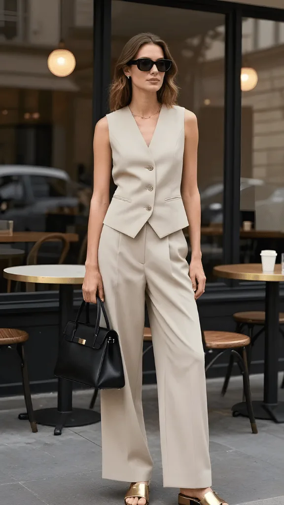 Sleek Beige Vest and Wide-Leg Elegance