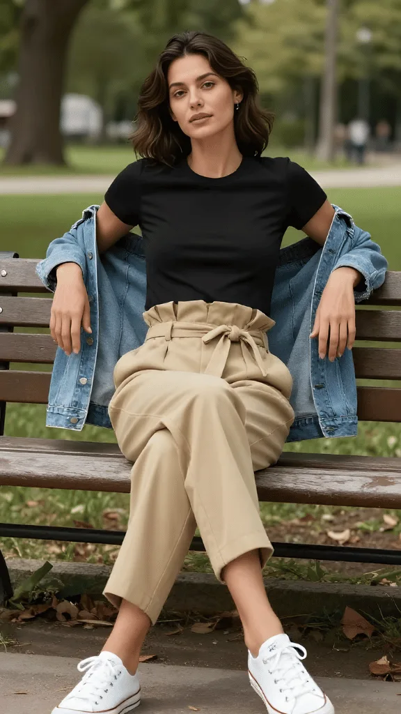 The classic denim jacket finds new purpose when layered over a simple black tee and paired with high-waisted beige paperbag pants. This look represents chic casual spring outfits 2026 in its most approachable form—familiar pieces styled in a way that feels current and considered. The paperbag waist adds visual interest and creates a flattering silhouette that’s both comfortable and polished.