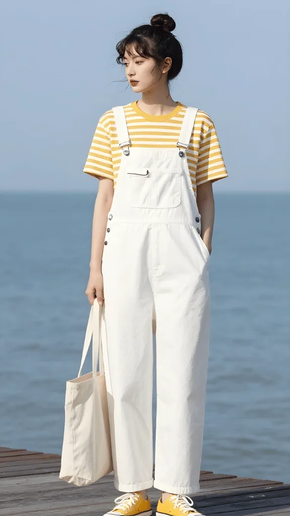 Nothing captures spring’s playful spirit quite like this combination of yellow and white striped tee with crisp white denim overalls. This look embodies fresh casual spring style inspo for women who aren’t afraid to embrace a youthful, optimistic aesthetic. The horizontal stripes add visual interest and a nautical feel, while the overalls provide a relaxed, vintage-inspired foundation that’s surprisingly versatile.