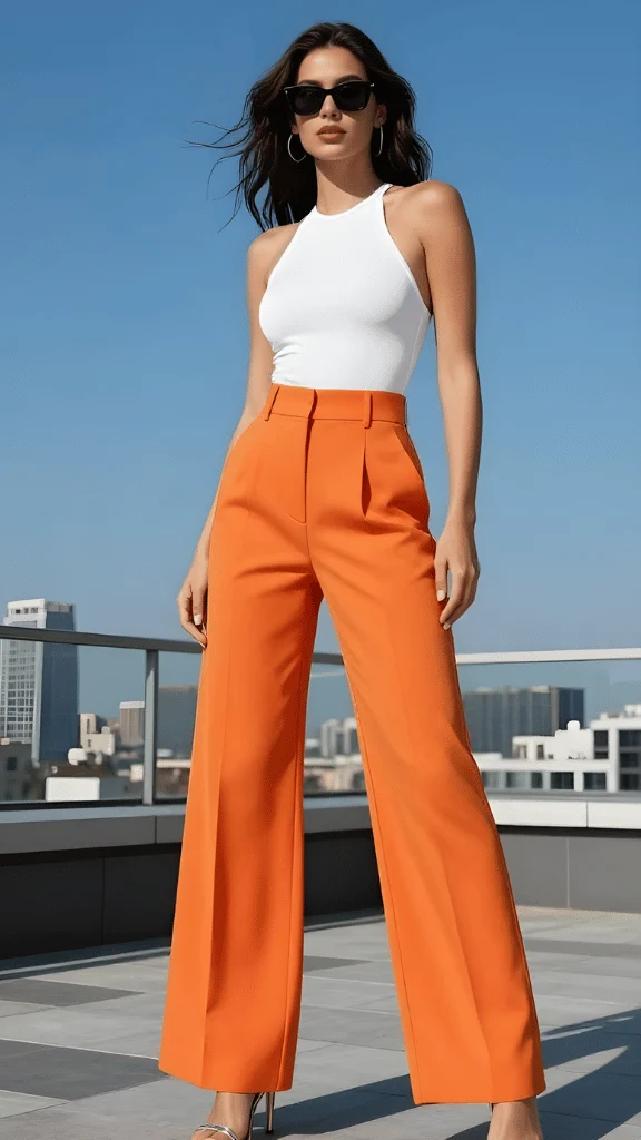 Make a statement with this striking color-blocked ensemble featuring vibrant orange wide-leg trousers paired with a sleek white halter top. This look exemplifies how bold monochrome spring outfits 2026 can create maximum impact with minimal pieces. The high-waisted orange pants elongate the legs while their pleated front and structured fabric maintain a polished appearance suitable for various occasions.