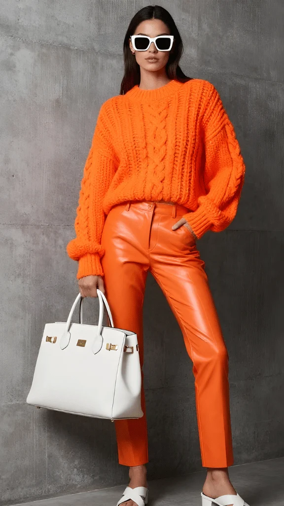 The orange leather pants bring an edgy sophistication that elevates the cozy sweater into high-fashion territory. This combination demonstrates how everyday spring outfits 2026 ideas can push boundaries while remaining wearable. The monochromatic approach creates a cohesive, intentional look that shows fashion confidence and awareness of current trends without slavishly following them.