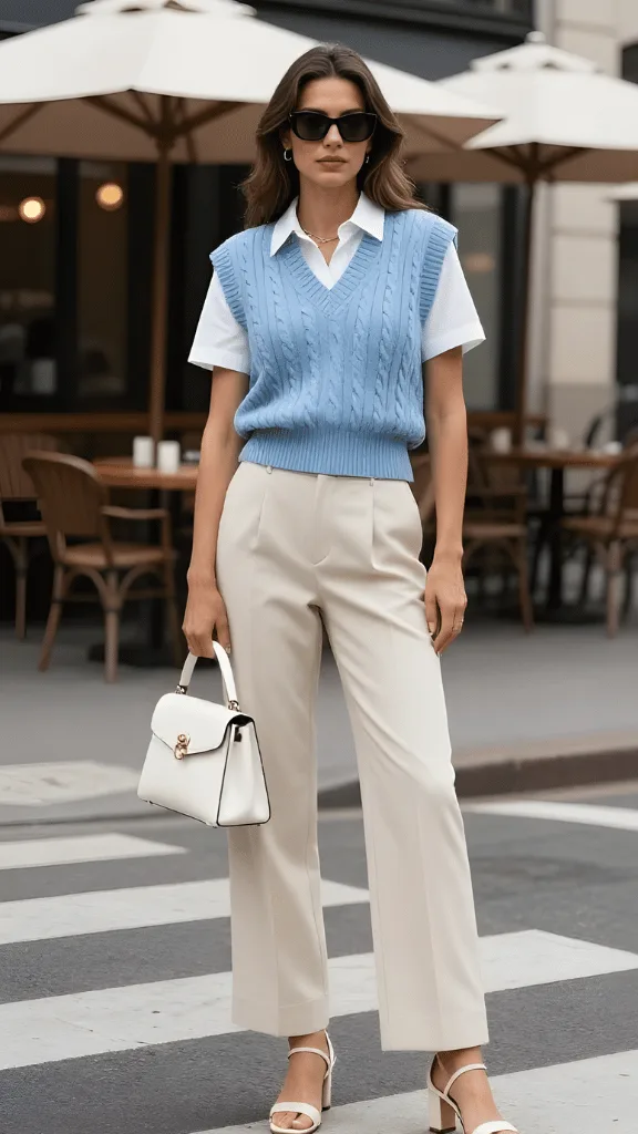 Embrace modern preppy style with this layered look featuring a light blue cable-knit sweater vest over a crisp white short-sleeve shirt. This ensemble represents parisian spring layers blue vest and neutrals at their most wearable—it’s sophisticated without being stuffy, polished without appearing overdressed. The sweater vest adds warmth and texture while maintaining a sleek silhouette that’s perfect for spring’s unpredictable temperatures.