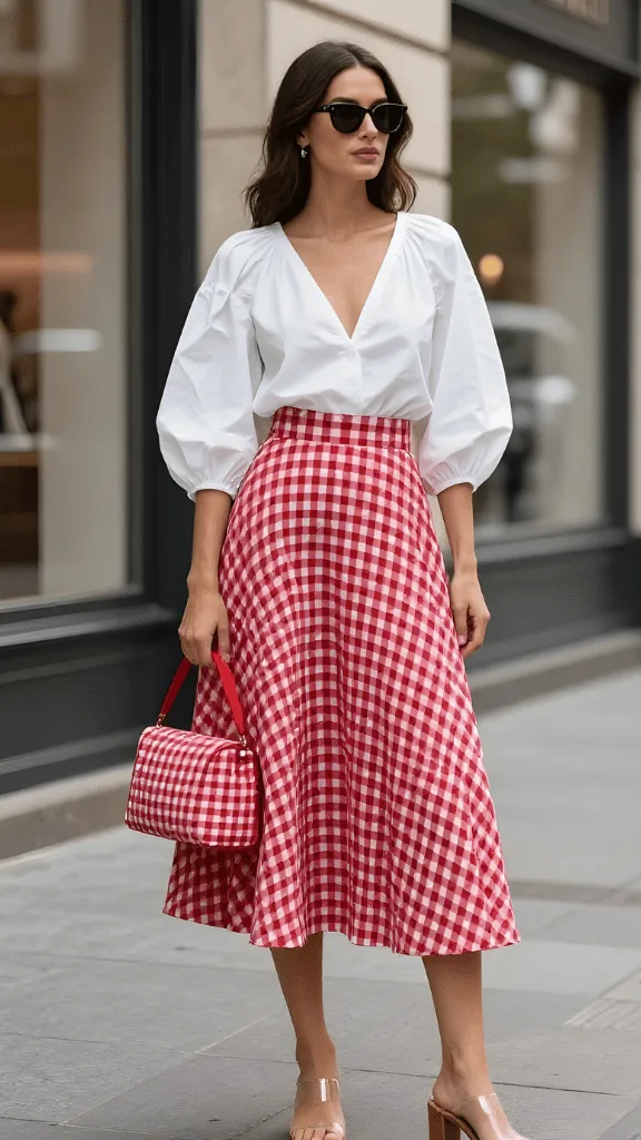 Embrace spring’s romantic side with this charming ensemble featuring a red and white gingham midi skirt paired with a white puff-sleeve blouse. This look represents gingham skirt and puff sleeves spring look at its most enchanting—the combination of pattern, volume, and flowing fabric creates a distinctly feminine aesthetic. The A-line gingham skirt with its cheerful check pattern brings playful sophistication that’s both vintage-inspired and thoroughly modern.