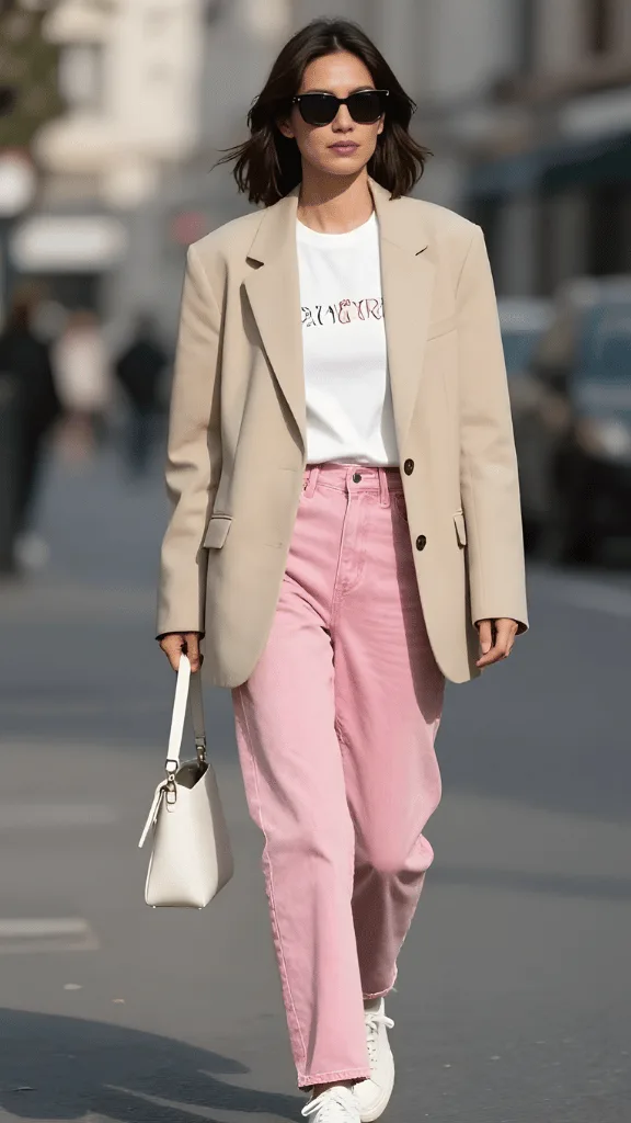 Neutral tailoring meets playful color in this sophisticated yet approachable outfit featuring a beige oversized blazer paired with soft pink denim. This look beautifully demonstrates how soft neutrals with a pop of pink can create a modern, feminine aesthetic without feeling overly sweet or juvenile. The structured blazer adds professional polish while its relaxed fit keeps the vibe casual and contemporary.