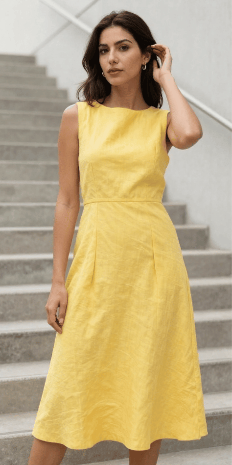 This yellow sleeveless A-line dress is clean, simple, and quietly flattering—my favorite kind of understated. I love the structured bodice and the gentle flare; it creates shape without clinging, which is perfect when you want to feel comfortable through dinner and dancing. For a stylish spring wedding guest outfit, a minimalist silhouette in a sunny color feels modern and joyful. The image shows a sleek sleeveless fit with a classic A-line midi shape in bright yellow.