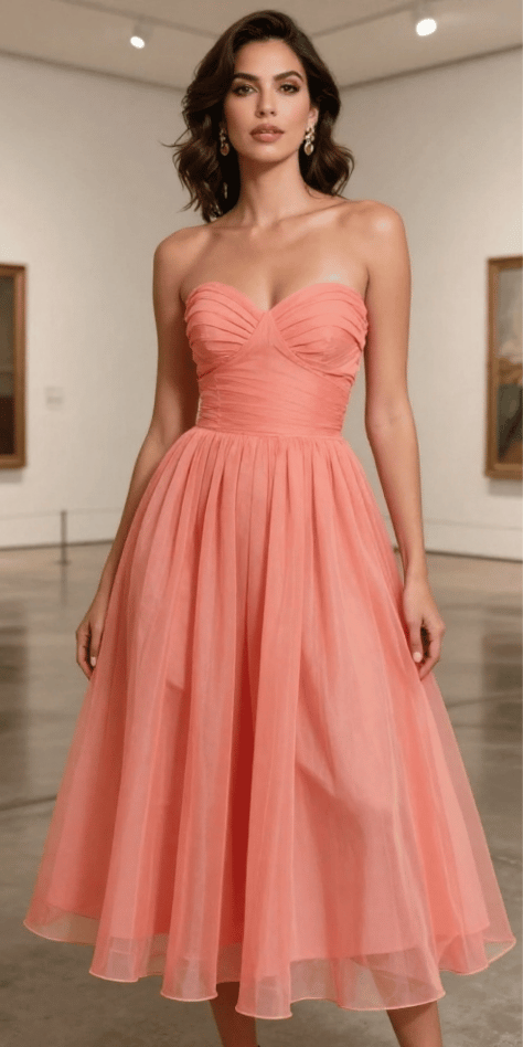 This strapless coral tea-length dress is exactly what I picture when I think “fresh spring celebration.” I love the softly ruched bodice and the floaty, full skirt—it feels like a modern fairytale, but wearable. For a stylish spring wedding guest outfit, coral is that sweet spot: warm, joyful, and photogenic without stealing focus from the couple. The image shows that perfect twirl-ready skirt moment you want for cocktail hour.