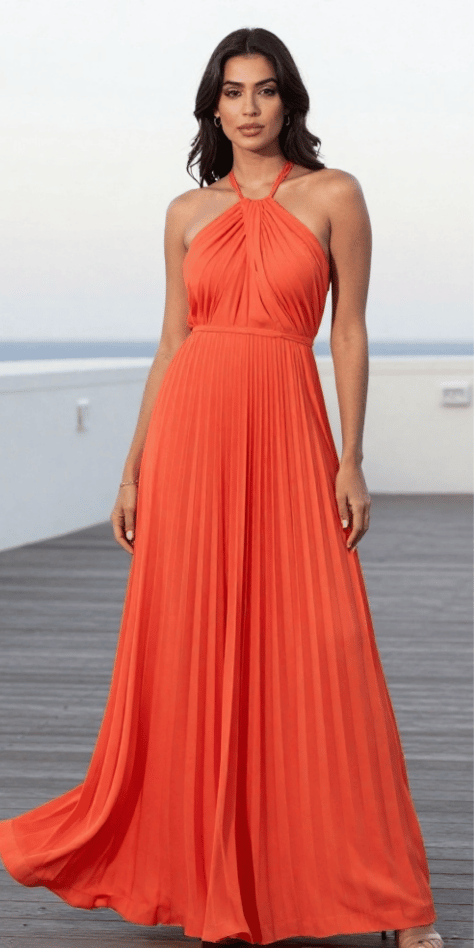 This pleated coral halter maxi is made for outdoor weddings—the kind where the breeze does half your styling for you. I love the vertical pleats because they create movement and length, and the halter neckline feels elegant without being fussy. For spring wedding outfits for women, this is a dreamy choice for beach, vineyard, or destination settings. The image shows that gorgeous floor-length flow and warm coral tone that glows in sunlight.