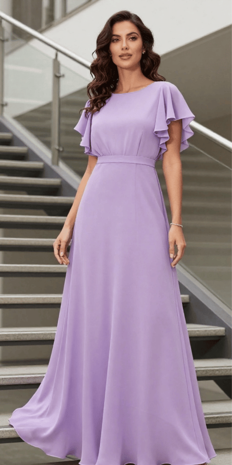 Lavender feels so right for spring 2026—soft, romantic, and a little bit fresh compared to the usual blush. I adore this floor-length lavender gown with flutter sleeves; it looks airy and elegant, and it gives that “effortless goddess” vibe without being too much. For spring wedding guest outfit ideas, lavender is one of my top color picks because it photographs beautifully in both indoor and outdoor light. The image shows a flowing A-line silhouette that feels serene and elevated.