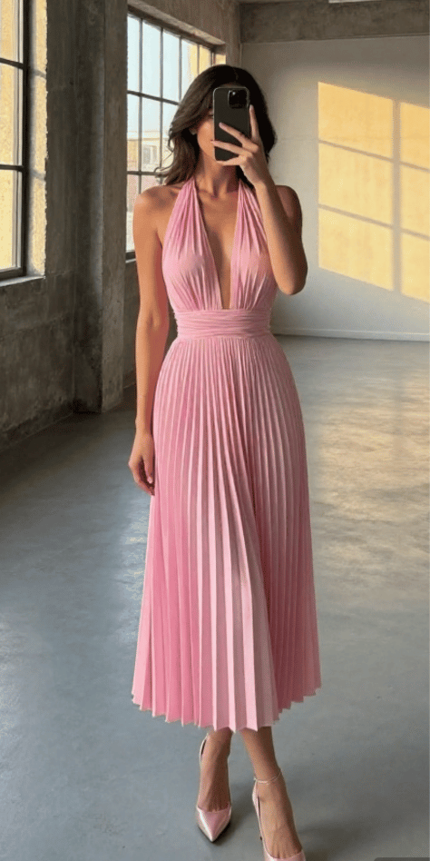 This rose-gold pleated halter dress is for the guest who wants a little shine—without going full disco ball. I love the metallic shimmer paired with soft pleats because it feels elevated and celebratory, especially for evening receptions. For a spring wedding guest outfit 2026, this is such a smart pick when the venue is modern, candlelit, or rooftop. The image shows a luminous bronze-rose tone and a pleated silhouette that catches every flicker of light.