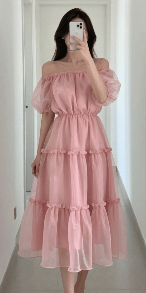 This pink off-shoulder tiered dress is pure romantic whimsy—and I mean that in the best way. I love the soft volume, the tiers that sway when you walk, and the off-shoulder neckline that feels playful but still polished. For spring wedding outfits for women, this is perfect for gardens, vineyards, and any setting where the dress can move with the breeze. The image shows puff sleeves, tiered ruffles, and that blushy pink tone that looks dreamy in daylight.