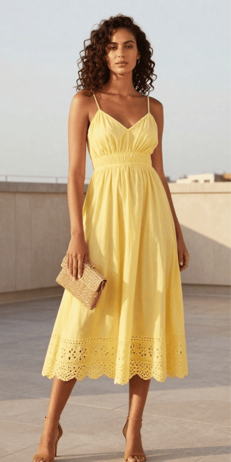 This butter yellow sundress with a lacey eyelet hem feels like the easiest kind of spring romance. I love the soft straps, the gentle waist definition, and that embroidered hem detail that makes it feel intentional—not just “a random cute dress.” For spring wedding guest outfit ideas, this is a gorgeous pick for casual-to-semi-formal daytime weddings. The image shows a light, sunny midi with delicate cutwork near the hem—so pretty and airy.