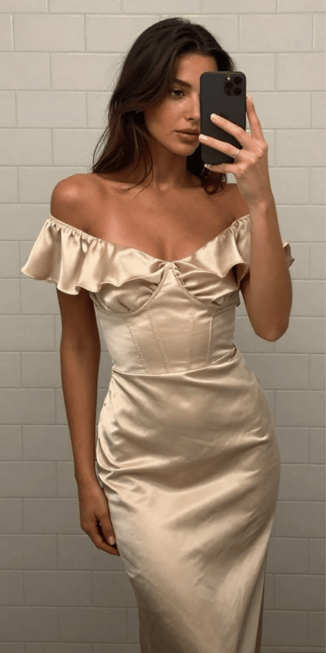 This champagne off-shoulder satin dress feels like pure old-Hollywood polish—but updated. I adore the structured neckline and the fitted bodice; it’s the kind of silhouette that makes you stand a little taller without even trying. For a stylish spring wedding guest outfit, champagne satin is incredibly versatile and always reads elegant. The image shows a refined off-shoulder neckline and a sleek, fitted finish that’s perfect for more formal venues.
