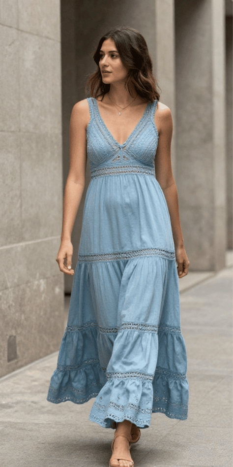 This powder blue tiered maxi feels soft, romantic, and a little bit bohemian in the prettiest way. I love the crochet details—they add texture that makes the dress look special even from a distance. For spring wedding guest outfit ideas, this is ideal for outdoor ceremonies where you want movement, comfort, and that effortless vibe. The image shows a tiered silhouette with delicate crochet bands and a gentle V neckline—so dreamy.