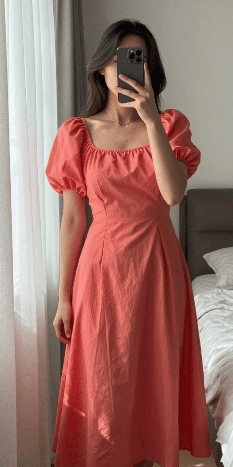 Coral Puff-Sleeve Midi With Square Neckline