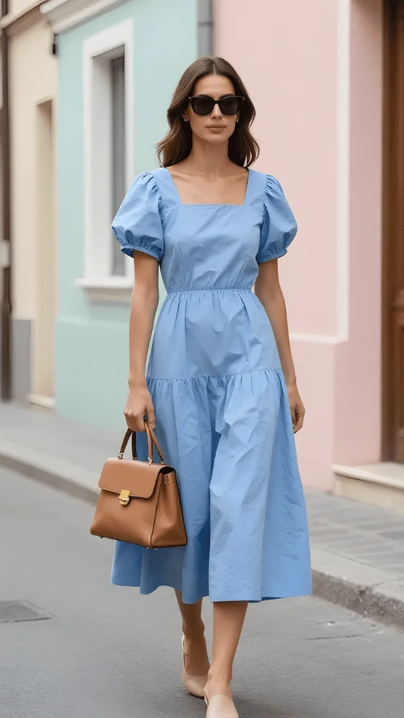 Few things feel more vacation-ready than a beautiful midi dress in sky blue cotton. The puff sleeves and square neckline give this piece a romantic, almost vintage feel, while the tiered skirt moves beautifully with every step. This is watercolor dress warm spring destinations outfit energy captured in a single garment.