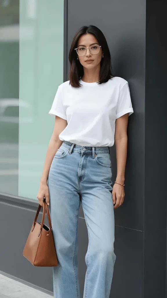 The key to making this simple combination feel intentional lies in the details. Slightly oversized glasses add an intellectual edge, while a quality leather tote in warm cognac brings richness and functionality. The jeans themselves—high-waisted with a gentle wide leg—create elegant proportions that elongate the body and move beautifully.