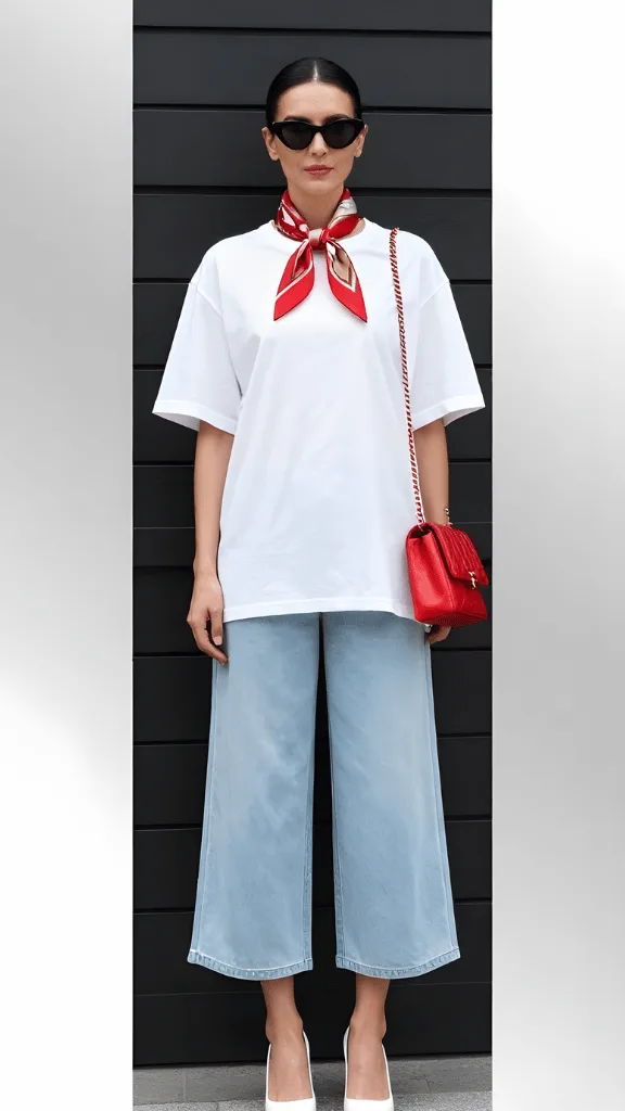 Accessories can transform even the simplest outfit into something special, and this look proves it beautifully. An oversized white tee paired with light wash denim culottes creates a relaxed foundation, while a printed silk scarf in red and white adds instant Parisian sophistication. This is stylish spring vacation outfits 2026 with an editorial edge.